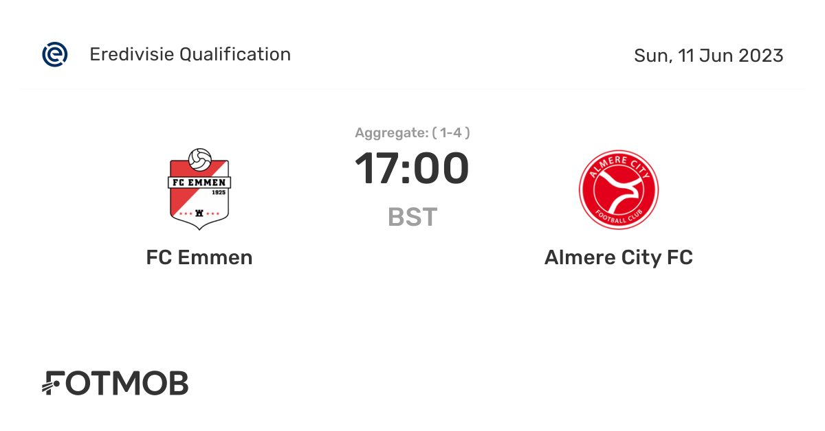 Bekijk alles rondom de wedstrijd Almere City FC-FC Emmen (06-06-2023) (2-0) Menu. Inloggen Home; Wedstrijden; Competities; Video; Podcast; VI PRO; Word VI PRO-lid. FC Emmen staat voor hels karwei in return tegen Almere City FC. 6 jun. 2023. FC Emmen moet vrezen: Eredivisie dichter bij dan ooit voor Almere City. 6 jun. 2023.