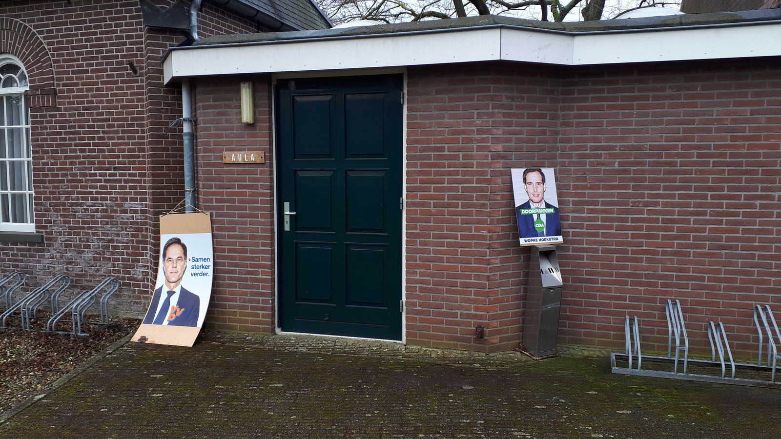 Verkiezingsborden vlakbij de ingang van het stembureau, mag dat eigenlijk wel? Foto