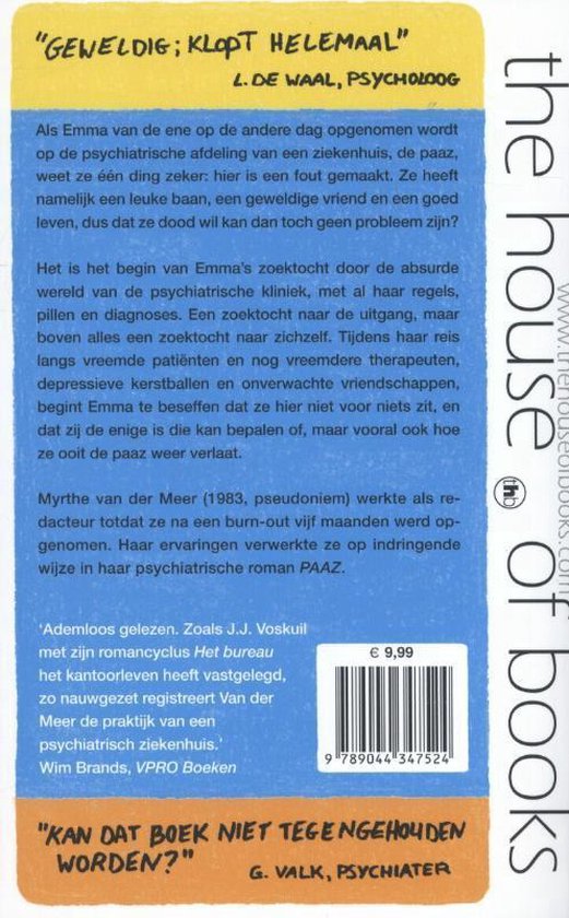 Introductie. Myrthe van der Meer (1983, pseudoniem) was jarenlang redacteur voor ze in 2012 doorbrak met haar autobiografische boek PAAZ, waarin ze vertelt over de tijd waarin ze opgenomen was op een psychiatrische afdeling.Sommige situaties die ze beschrijft, zijn ronduit frustrerend, maar vaak voert humor de boventoon.