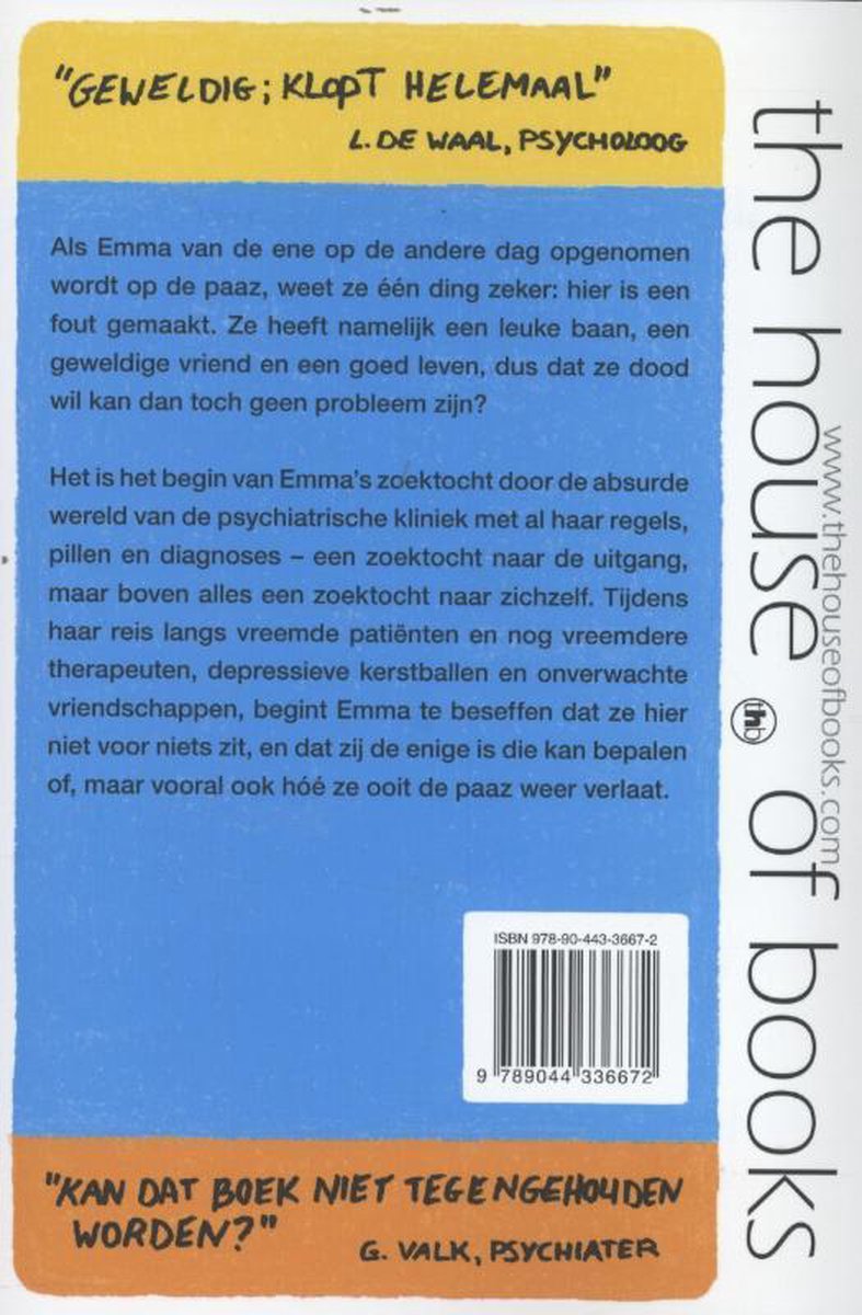 PAAZ - Myrthe van der Meer. Als Emma van de ene op de andere dag opgenomen wordt op de PAAZ, weet ze één ding zeker: hier is een fout gemaakt. Ze heeft namelijk een leuke baan, een geweldige vriend en een goed leven, dus dat ze dood wil kan dan toch geen probleem zijn? Het is het begin van Emmas zoektocht door de absurde wereld van de.