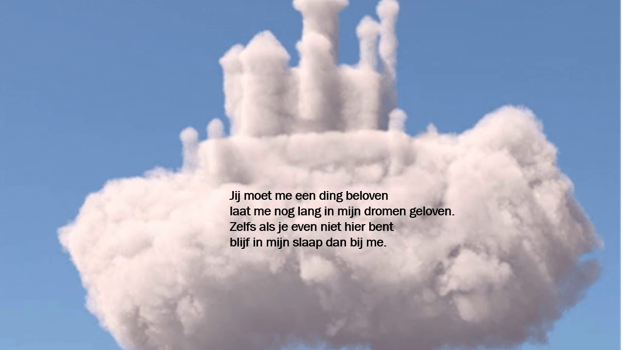 De meeste dromen zijn bedrog. Maar als ik wakker wordt naast jou dan droom ik nog. Ik voel je adem en zie je gezicht. Je bent een droom die naast me ligt. Je kijkt me aan en rekt je uit. Een keer.