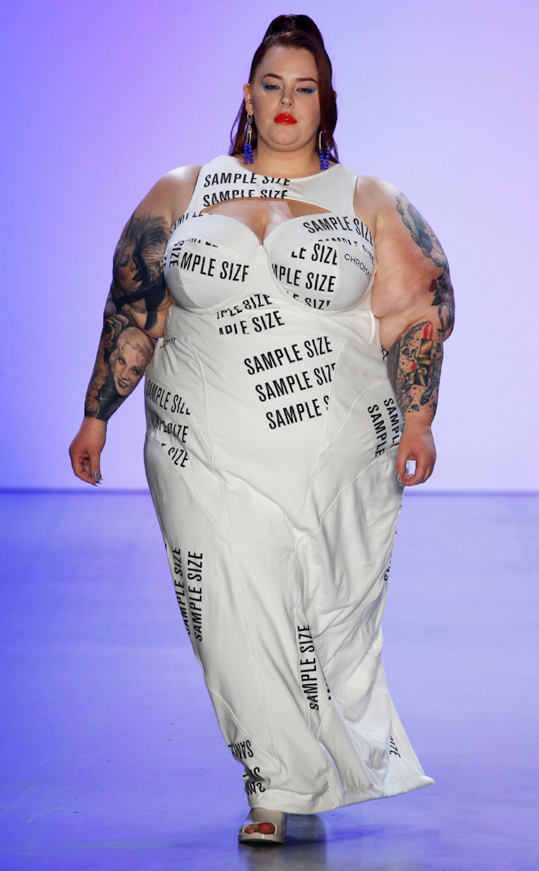 Tess Holliday was a part of Chromat's show at New York Fashion Week. She rocked a dress that was printed with "sample size" all over it, which is seemingly a.
