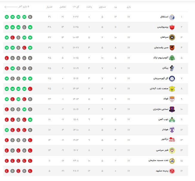 جدول لیگ برتر فوتبال ایران پایان هفته هفدهم تابناک TABNAK